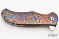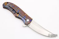 This Shamal 5.0 Framelock Flipper by DB Fraley features a hand rub satin finished blade with flipper. The handle has a full Timascus frame, has a lost skulls carved tip up clip and backspacer, lanyard hole at the butt. Comes with original leather case. Excellent condition. #02 on the blade spine. Rides on bearings, nice detent, lockup and blade seating.