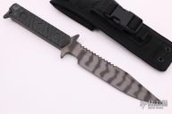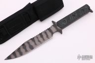 This D9 by Strider features a tiger stripe blade with serrations on the blade spine and sharpened top edge, .240" blade stock and 1.412" blade depth, Integrated double guard with green/black G-10 scales. Comes with nylon tactical sheath. The blade has some light scuffs, otherwise excellent condition.