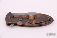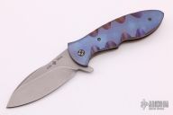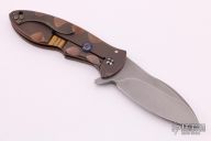 This Gyrfalcon framelock folder by Eric Ochs features a stonewashed blade with false top edge and flipper. Handle is comprised of a timascus front scale and anodized titanium frame and tip up clip, timascus backspacer and lock bar stabilizer. Nice blade seating, detent and lockup, rides on bearings. Great work. Has a couple light scratches, otherwise excellent condition.