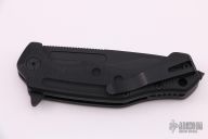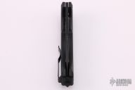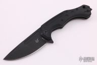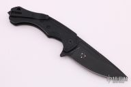 This FX-520 by Fox Cutlery features a black blade with notched thumbrest, fullers and flipper. The handle has black G-10 scales and backspacer, black stainless steel liners and tip up clip. Nice detent, lockup and blade seating. Has some light scuffs on the blade, otherwise excellent condition.