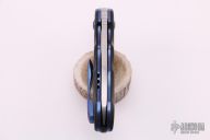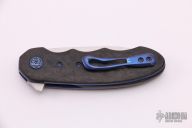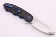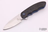 This Kiba flipper from Larevo Knives (Jason Overall) features a satin finished drop point blade with notched thumbrest and flipper. The handle has carbon fiber scales, anodized titanium liners, pivot collards, screws and tip up clip, carbon fiber backspacer. This knife flips well on caged bearings. Nice detent, lockup and blade seating. Excellent condition.
