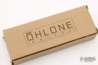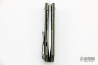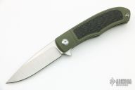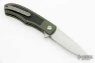 This Rumsen by Ohlone Knives features a satin finished blade with notched flipper. The handle has green G-10 scales and textured carbon fiber inlays, textured carbon fiber backspacer, bead blasted titanium liners, clip and hardware. Rides on bearings, nice detent, lockup and blade seating. Comes with original box. New from maker. Very nicely constructed.