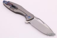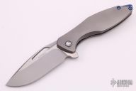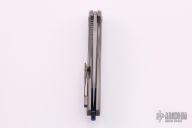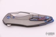 This Arius by Koenig knives features a two-tone blade with thumbhole and flipper. The handle has a nicely milled titanium frame with an anodized tip up clip, blue anodized titanium backspacer. Has ceramic bearings and a ceramic detent ball. Nice detent, lockup and blade seating. Excellent condition.