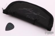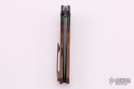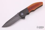 This Modified RAINE Flipper by Kirby Lambert features a Chad Nichols stainless Damascus blade on bearings , the bolsters are Black Carboquartz with vintage Butterscotch paper Micarta scales . The accents include Heat colored Mokuti pivot rings anodized Titanium pivot and hardware , custom Zirconium clip and a Carbon Fiber back spacer. Excellent condition. Comes with zippered case and guitar pick.