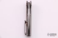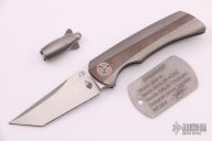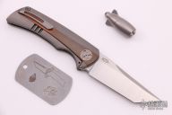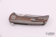 This Spar-K by WingMan EDC features a satin finished tanto blade with notched thumbrest and "Kickstop" flipper. The handle has a tumbled titanium frame with copper inlays, lanyard pin, tip up clip with hidden screws. Comes with original box and papers. Excellent condition. #264