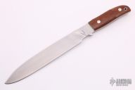 This knife from Jim Webb features a drop point blade with .123" blade stock and 1.344" blade depth, full tang construction. The handle is comprised of brown canvas micarta scales. Lanyard hole in pommel. Includes a zippered case. Excellent condition.