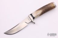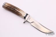 This custom hunter by Jim Webb features a satin finish blade with .252" blade stock and 1.120" blade depth, hidden tang construction. Stainless steel guard and butt cap with a stag grip. Webb is the nephew of G.W. Stone, co-founder of the original Knifemakers Guild. This piece is similar to a Stone MK series. Excellent condition. Comes with a zippered case. #103