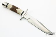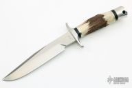 This Fighter from Jim Webb features a satin finish clip point blade with false top edge, .245" blade stock and 1.267" blade depth, hidden tang construction. The handle is comprised of stainless steel double guard with black linen micarta and steel spacers, stag handle and steel pommel with lanyard hole over hidden tang construction. Includes padded and zippered case. Excellent condition.