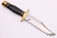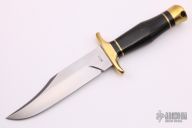 This Fighter from Jim Webb features a satin finish clip point blade with false top edge, .250" blade stock and 1.364" blade depth, hidden tang construction. The handle is comprised of a brass double guard with black linen micarta and brass spacers, black linen micarta handle and brass pommel with lanyard hole over hidden tang construction. Includes padded and zippered case. Excellent condition. #102