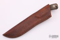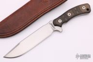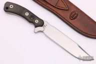 This Field Knife by Fehrman Knives features a hand rub satin finished blade with a notched thumbrest and false top edge, .190" blade stock and 1.250" blade depth, full tang construction. The handle has black/green linen micarta scales. Comes with brown leather sheath. Has some scratches, otherwise good condition. #008