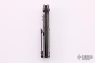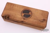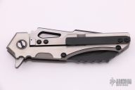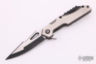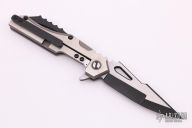 This Raptor by Solid Steel Works features a two-tone multi-ground blade with notched thumbrest, thumbhole and flipper. The handle has an two-tone titanium frame with black titanium backspacer and tip up clip. Comes with a custom wooden box and COA dated Nov 17, 2017. Excellent condition.