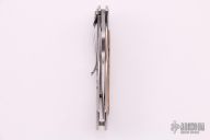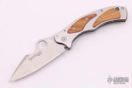This knife features a satin finished blade with a thumbhole. The handle has a satin finished stainless steel frame with wood inlays and tip down stainless steel clip. Comes with original box and papers. Excellent Condition.