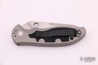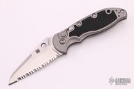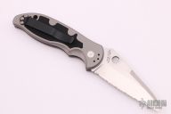 This C121S Embassy from Spyderco features a clip point style blade with swedge, serrated edge, small thumb hole and notched thumb ramp. The handle is comprised of an aluminum frame with black G10 inlays. Lanyard hole in pommel. Reversible black coated stainless steel tip up clip. Blade is deployed via push button with fast coil spring action. Sliding safety on "A" side of handle. Light marks on pocket clip and "B" side G10 inlay. Includes original box and papers.