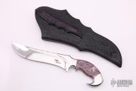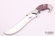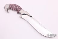 This Eridanus by Steven Ramos features a mirror polished recurve blade with fileworked spine, .267" blade stock and 1.818" blade depth, full tapered tang construction with filework all around the tang. The handle has dovetailed and mirror finished 304 stainless steel bolsters, front and rear, and polished Lepidolite scales. Comes with a black leather sheath with ostrich leg skin inlay. Comes with material plaque and is #58-13. New from maker.
