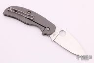 This C123TIP Sage 2 by Spyderco features a satin finished blade with thumb hole, notched thumb rest and choil. The handle is comprised of a bead blasted titanium frame over barrel spacers. Steel wire tip up clip is reversible for left or right hand carry. Great blade seating and lock up. Excellent condition.