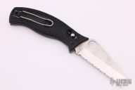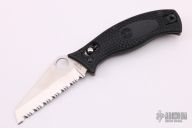 Like most rescue/emergency knives its rounded sheepfoot blade has no pointed tip. Evenly thick from heel to tip, the blade is hollow-ground VG-10 and comes fully serrated with a SpyderEdge. Its handle is three-dimensional and Bi-Directionally Textured on both sides. This makes for comfortable ergonomics and reduces fatigue while cutting long-term. Tucked inside the handle are rigid dual steel liners and a Ball Bearing Lock. The Ball Bearing Lock has an heavy-duty level strength rating. This means that the lock holds more weight per inch of blade than normal use knives. Comforting peace-of-mind when your knife could make the difference at an accident scene or on duty. Both the lock and the tension wire clip are ambidextrous. Pocket clip carries tip-up.