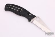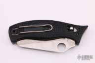 Like most rescue/emergency knives its rounded sheepfoot blade has no pointed tip. Evenly thick from heel to tip, the blade is hollow-ground VG-10 and comes fully serrated with a SpyderEdge. Its handle is three-dimensional and Bi-Directionally Textured on both sides. This makes for comfortable ergonomics and reduces fatigue while cutting long-term. Tucked inside the handle are rigid dual steel liners and a Ball Bearing Lock. The Ball Bearing Lock has an heavy-duty level strength rating. This means that the lock holds more weight per inch of blade than normal use knives. Comforting peace-of-mind when your knife could make the difference at an accident scene or on duty. Both the lock and the tension wire clip are ambidextrous. Pocket clip carries tip-up.