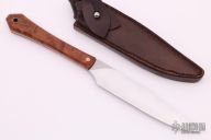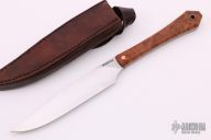 This Coffin Handle Clip Point by James Scroggs features a high satin finished clip point blade, .093" blade stock and 1.038" blade depth, full tang construction. The handle has birdseye Oregon Myrtle wood scales with copper pins. Comes with a brown leather sheath New from maker.