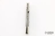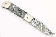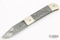 This knife by Steve Dunn features a Damascus blade with a single thumbstud. The handle has nickel silver bolsters, Damascus backspacer and scales, titanium liners. Nice detent, lockup and blade seating. Excellent Condition. Includes padded zippered case.
