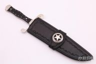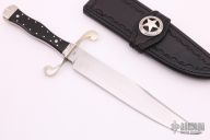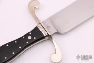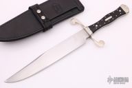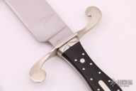 This Bowie by Master Smith David Anders features a hand rub satin finished clip point blade with a sharpened top edge, visible temper line, .194" blade stock and 1.348" blade depth, hidden/frame tang construction. The handle has a nickle silver guard, fluted and fileworked spacers and rear bolsters, ebony wood scales, nickel silver frame, escutcheon and domed pins. Comes with a hand tooled black leather sheath made by Rowe's Leather. Has some scratches, otherwise excellent condition.