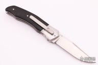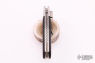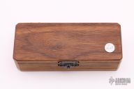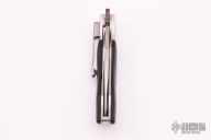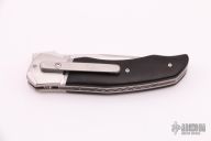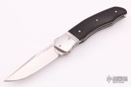This knife by GH Knives features a hand rub satin finished blade with swedge and notched thumbrest, front flipper style opening, engraved blade spine.  The handle has fluted and treaded stainless steel bolsters with ebony wood scales, satin finished titanium liners, engraved stainless steel backspacer, tip down titanium clip. Comes with wooden box and COA. New from maker. Very nice attention to detail. "Canada 2020" inside backspacer.