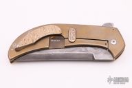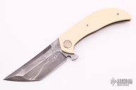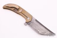 This knife by Jody Muller features a Damascus Tanto blade with flipper and false top edge. The handle has a Westinghouse paper micarta scale and backspacer, orange peel and anodize finished titanium frame with mokume pivot, lockbar stabilizer and tip up clip with hidden screws. Rides on bearings, nice detent, lockup and blade seating. Excellent condition. Comes with a zipered case.