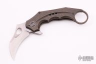 This folding karambit by WE Knife Company features a stonewashed hawkbill blade with thumbhole and notched thumbrest and flipper. The handle has a milled, anodized and tumbled titanium frame with matching tip up clip and backspacer with finger hole. Rides on bearings. Comes with nylon zippered case. Excellent condition.