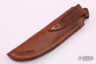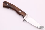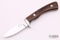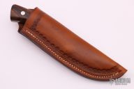 This small hunter from Larry Page features a polished drop point blade, .120" blade stock and .887" blade depth, full tapered tang. The handle is comprised of a polished stainless steel single guard with ironwood scales over red liners and full tapered tang construction. Marked #4862 on the underside of the tang and on the back of the sheath. Minor scuffs on guard, but otherwise excellent condition. Includes leather sheath with belt loop.