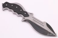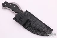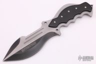 This Vindicator by Dark Ops features a two-tone blade with fullers and serrated portion on the spine, .227" blade stock and 2.131" blade depth, full tang construction with black paper micarta scales. Comes with a custom leather over kydex sheath and a zippered case. Excellent condition.