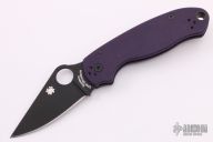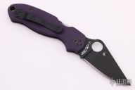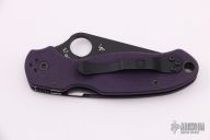 This Para 3 by Spyderco features a black finished clip point blade with thumb hole and notched thumbrest. CPM Cruwear Blade Steel. The handle is comprised of purple G-10 frame over nested steel liner and stand-offs. The steel pocket clip is 4 way adjustable. Includes original box and paperwork. Excellent condition.