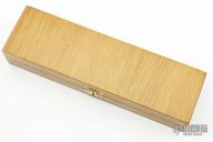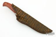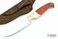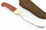 This fixed blade from Stephen Mackrill features a mirror finished drop point blade with fileworked thumbrest, .115" blade stock and 1.074" blade depth, full tang construction. The handle has bone bolsters, red ivory wood scales with silver wire inlays. Comes with a buffalo hide sheath, wooden box and COA dated 1-31-98. Has some patina, otherwise excellent condition.