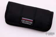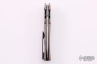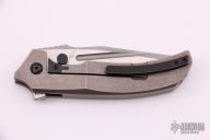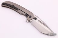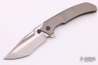 This Satori by Custom Knife Factory is a Peter Rassenti Design, the blade is two-tone finished with notched thumbrest and flipper. The handle has a tumbled titanium frame with tip up black titanium clip, lanyard hole, stainless lock face insert with overtravel stop. Rides on bearings, nice detent, lockup and blade seating. Comes with nylon Velcro case and extra hardware. Excellent condition. #515 on flipper tab.