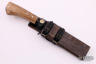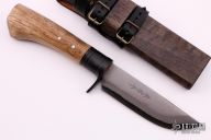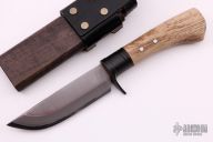 This KB-414 Sazanami from Kanetsune features a drop point Blue Steel#2 / 15 layer Damascus blade.  .202" Blade Stock.  1.343"Blade Depth.  The handle features a metal guard complemented by a oak wood handle over a hidden tang construction.  Includes a leather and wood sheath.  Excellent Condition.