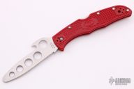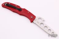 This year's knife industry trends appear to be leaning toward making functionality fun and techie with folding knife features like the Emerson opening feature leading the parade. Popularized and patented by Ernest Emerson of Emerson Knives, the opening feature is a hook curving out the blade's spine that catches the edge of your pant's pocket when drawing the knife. It quickly opens the knife blade so it's locked and ready to use. The fact there is a learning curve in using the opening feature makes a this trainer applicable. Gaining proficiency in safely handling and opening an Emerson folder comes through repetitive practice. Delica and Endura Emerson Opener Trainers are identically sized, proportioned and weighted replicas of their "live" counterparts sans a sharpened edge and point. Designating them trainers are their red FRN handles. The handles have Bi-Directional Texturing™ for traction and screw-together construction for cleaning and adjustment. To reduce weight the dual handle liners are skeletonized stainless steel and holes in the blade remove even more ounces. Phosphor bronze washers smooth open/close action and the clip attaches in four-positions: tip-up/ tip-down, left- or right-hand. Comes with original box and papers. Excellent condition
