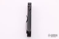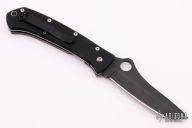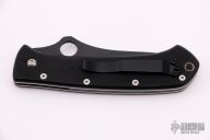 This Bob Lum designed folding knife by Spyderco features a black tanto style blade marked with the Lum Logo. Stainless steel liners. Textured black G-10 scales. Spyderhole opening. Nice detent, lockup and blade seating. Has some scuffs on the blade, otherwise the knife is in good condition.  Includes a padded zippered case.