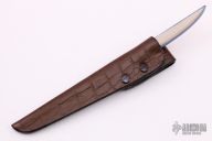 This Titanium Stiletto by PJ Ernest features an anodized titanium spear point blade with false top edge, .124" blade stock and .586" blade depth, full tang construction with tan G-10 scales. Comes with a brown leather covered kydex sheath with a belt loop. Comes with zippered case. Has some light scratches, otherwise excellent condition.