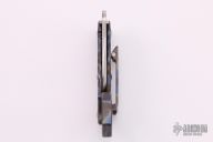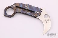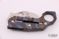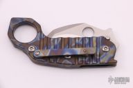 This Karambit Framelock by Steve Ryan features a satin and tumbled chisel ground hawkbill blade with swedge and thumbhole. The handle is comprised of a flamed and milled titanium frame with ring at the butt and a matching tip up titanium clip with roller ball. Nice detent, lockup and blade seating. Excellent condition.