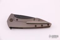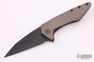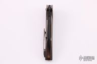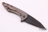 The Koenig Mini-Goblin 3 inch folding pocket knife is a collaboration between Edison Barajas of Sharknivco and Koenig Knives. The Mini-Goblin features a 3-inch black coated blade with notched thumbrest and flipper. The handle has a tumbled and anodized titanium frame with a stonewashed titanium backspacer and tip up clip with hidden screws. Includes the original box. The box is in poor condition. The knife is in Excellent condition.