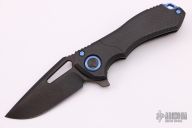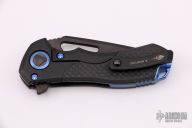 This Protocol Flipper by Marfione Custom Knives features a two-tone DLC Apocalyptic finished blade with notched thumbrest and flipper. The handle has a DLC Apocalyptic titanium frame with carbon fiber scales, blue anodized titanium backspacer and hardware, tip up titanium clip with ceramic ball and hidden screws. Nice detent, lockup and blade seating. Comes with original box and papers. Excellent condition. #025and dated 03/2020.