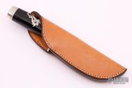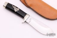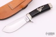 This Skinner by Ty Montell features a mirror polished blade with .168" blade stock and 1.529" blade depth, hidden tang construction. The handle has a nickel silver guard and butt, buffalo horn grip with inlaid nickel silver dragon escutcheons. Comes with a brown leather sheath. Excellent condition. #525