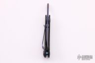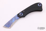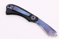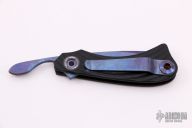 This friction folder by Warren Thomas features an anodized titanium tanto style blade with carbide edge. The handle has a milled black G-10 frame. Anodized titanium clip, tip up carry. Excellent condition.