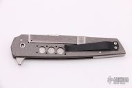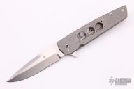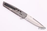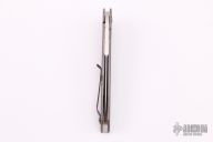 This Finger Bone framelock flipper by Jason Clark features a two-tone blade with a false top edge and checkered flipper. The handle has a tumble finished titanium frame with a black titanium tip up clip and a stainless steel backspacer. This piece features the IKBS and flips effortlessly. Blade is centered when closed and locks up with no play. Comes with leather zippered case. Excellent condition.