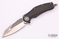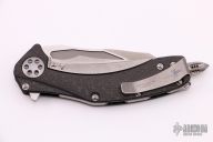 This Matrix flipper features a tri-tone blade with stonewashed grinds, satin flats, and bead blast cut-outs, flipper, and a notched thumbrest. The handle has a lightning strike carbon fiber frame with a titanium clip, tip up carry, and a titanium backspacer. Comes with original box, COA and zippered case. Dated 08/2015. Excellent condition.