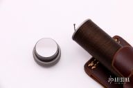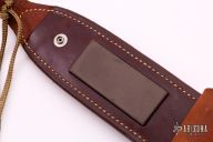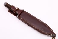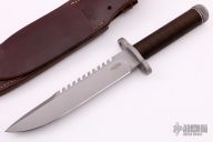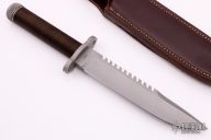 This survival knife by Timberline features a bead blasted spear point blade with serrated top edge and 10 saw-teeth on blade spine. .249" blade stock and 1.318" blade depth, hidden tang construction. The handle has a bead blasted titanium double guard, hollow cord wrapped handle, and stainless steel removable butt cap with an O-ring to make it water-proof. Comes with brown leather sheath that has a leather flap with a snap covering a honing stone that is embedded in the sheath. Inside the handle is a roll-up kit with a fire stick, and slots to hold other items. The cord that is around the handle is also one piece of cord that can be removed for survival use. The removable butt cap has a polished flat inside that can be used for signaling. The blade is stamped "384SA". This knife was well-thought-out and provides everything possible for survival. Excellent condition. Comes with nylon zippered case. Made in 1990.