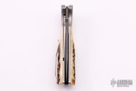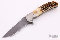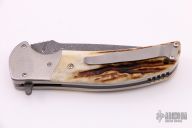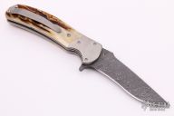 The RJ Martin Q-36 won the award for Best Tactical Folder at the 2007 Blade Show in Atlanta. This Q-36 flipper from RJ Martin features a Damascus drop point recurve blade with notched thumbramp and flipper The handle has orange peel finished titanium bolsters, orange peel finished titanium liners, stag scales and black G-10 backspacer, tip up titanium clip. Powerful and smooth flipper opening allows you to easily deploy the blade with no wrist action needed. Nice blade seating, detent and lockup. Excellent work. Comes with zippered case. Excellent condition.