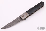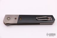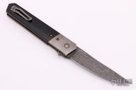 This Kwaiken Flipper by Lucas Burnley features a dark stonewash finished blade with swedges on the spine and notched flipper. The handle has tumbled titanium bolsters, black G-10 scales, tumbled and bronzed titanium liners, tumbled titanium backspacer and tip up titanium clip. Nice detent, lockup and blade seating. Rides on bearings. Excellent condition. Comes with a velcro case.