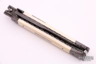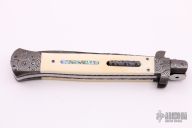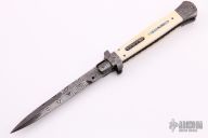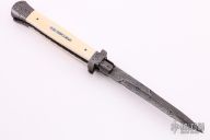 This Picklock by Burn Knives features a Mike Norris "Raindrop" Damascus bayonet style blade with false top edge, .202" stock. The handle has Damascus bolsters, front and rear, mammoth ivory scales with abalone inlays, fileworked Damascus push button, fileworked Damascus liners, stainless steel backspacer. Comes with a zippered case and COA. Excellent condition. Nice lockup, blade seating and action.
