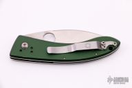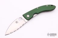 This Bob Lum Chinese folder by Spyderco has a satin fully serrated blade and green aluminum handle with reversible SS clip and single SS liner. Comes with original box. Light scratches are visible on the frame and clip otherwise the knife is in Excellent condition.