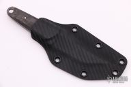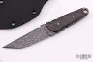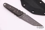 This knife by Apeiron Bladeworks features a "Lizard" Damascus blade with notched thumbrest .150" blade stock and .906" blade depth, full tang construction. The handle has marble carbon fiber scales and a lanyard hole at the butt. Comes with a Kydex sheath and COA dated March 2019. Excellent condition.