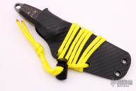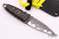 This knife by Apeiron Bladeworks features an Armor Core San Mai Damascus blade with notched thumbrest .208" blade stock and .859" blade depth, full tang construction. The handle has bronze infused carbon fiber scales and a lanyard hole at the butt. Comes with a Kydex sheath and COA dated March 2019. Excellent condition.